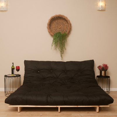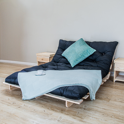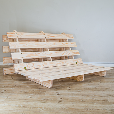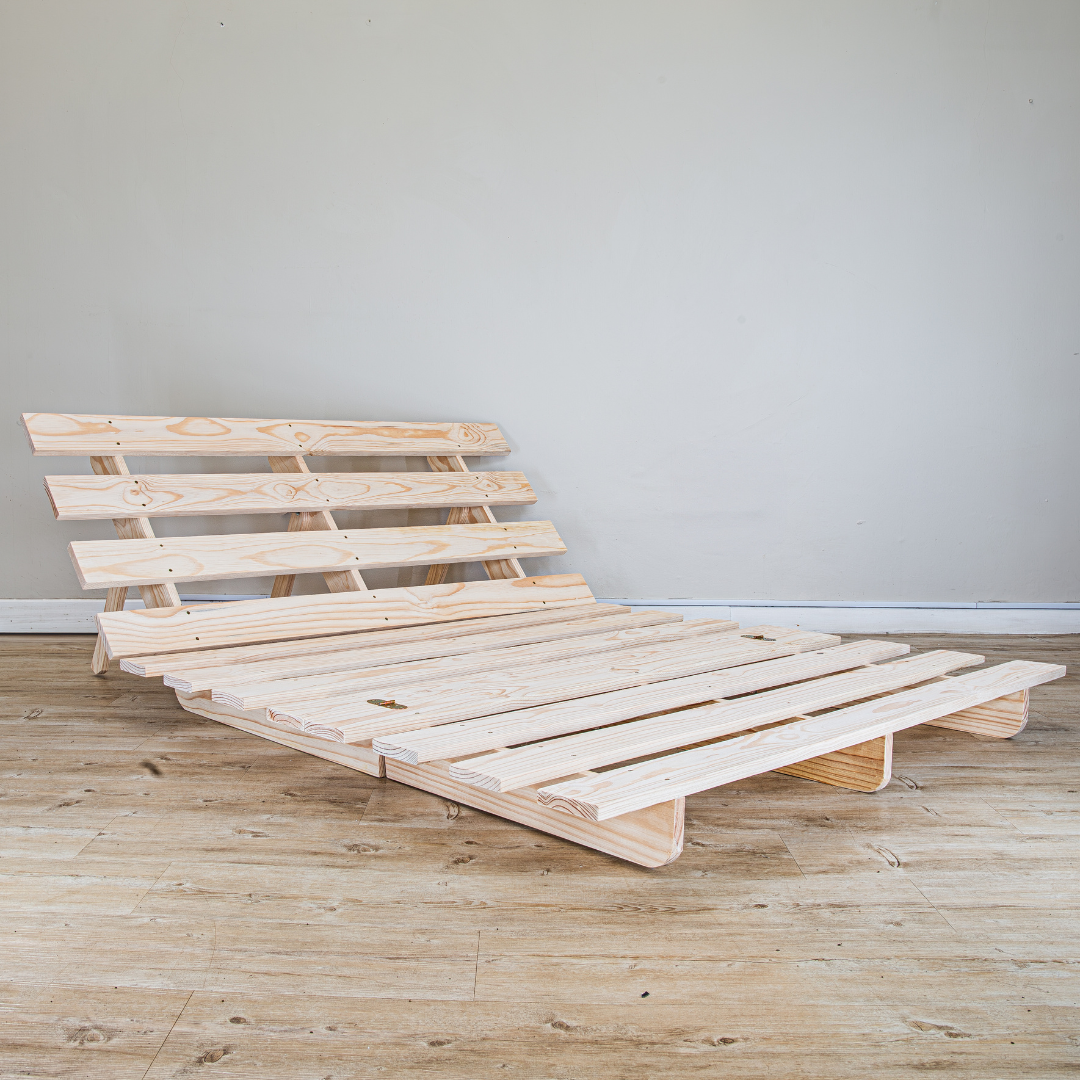 Futons Online's futon bases are crafted from raw, sanded-to-smooth, untreated pine. This natural finish provides a minimalist aesthetic and serves as the centerpiece that allows conversion from couch to recliner to bed.